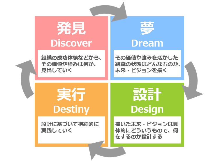 具体的には、4Dプロセスと呼ばれる、発見(Discover)、夢(Dream)、設計(Design)、実行(Destiny)という4つのフェーズに分かれて進めていきます。