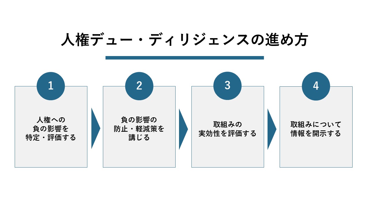 人権デュー・ディリジェンスは、「ビジネスと人権」の取組みの中核をなすプロセスです。以下の4つの手順を継続的に繰り返すことで、リスクを管理し、改善を図っていくものです。