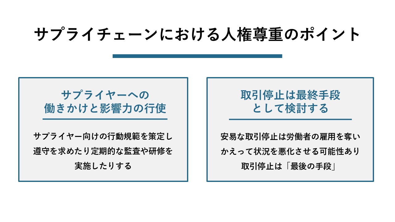 取引先で人権侵害が発覚した場合、即座に取引を停止することは、必ずしも最善の解決策とはいえません。安易な取引停止は、そこで働く労働者の雇用を奪い、かえって状況を悪化させる可能性があるためです。日本政府のガイドラインでも、取引停止は、改善への働きかけを繰り返し行ったにもかかわらず、状況が改善されない場合の「最後の手段」として検討すべきとされています。まずは取引関係を維持しながら、対話を通じて粘り強く改善を支援していく姿勢をとりましょう。