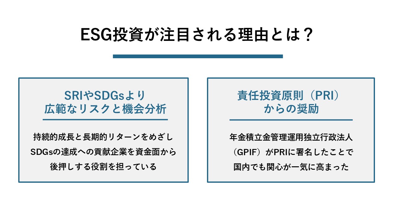 ESG投資が注目される背景には、2006年に国連が提唱した「責任投資原則(PRI)」があります。PRIは、投資家が投資判断を行う際にESGの視点を組み込むことを奨励するもので、世界の主要な機関投資家が署名しています。日本では、2015年に世界最大級の年金基金である年金積立金管理運用独立行政法人(GPIF)がPRIに署名したことで、国内でもESG投資への関心が一気に高まりました。長期的な資産形成をめざす上で、企業のESGへの取組みが経営の安定性や成長性を示す重要な指標として認識されるようになったのです。