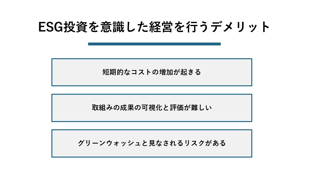 ESG投資を意識した経営は多くのメリットをもたらす一方で、企業にとっては無視できないデメリットも存在します。特に、短期的なコストの増加や、成果の評価の難しさは、企業がESG経営へ踏み出す際の大きな障壁となる可能性があります。