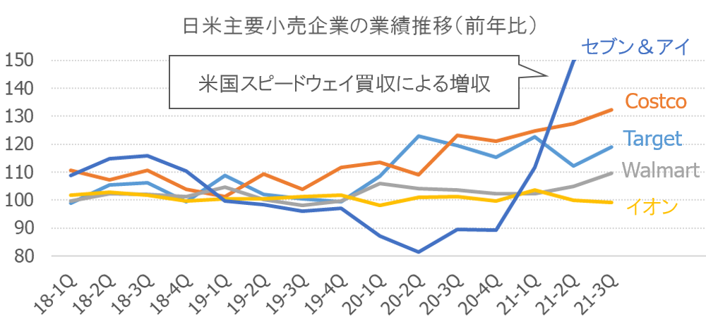 コロナ禍で大きな影響を受けた業界の一つに小売業があります。人流の制限や非接触、ECへの対応など大きな変化を求められました。では各企業の業績はどのように変化したのでしょうか。以下に米国と日本の代表的な小売業の業績推移を示してみます。