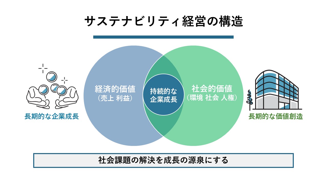 - サステナビリティ経営とは、社会課題の解決と企業の成長を両立させる長期的な経営戦略。