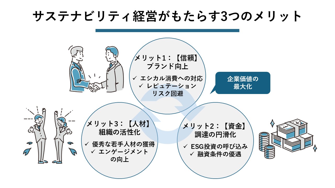 - サステナビリティ経営を進めると、企業ブランドの向上、資金調達の円滑化、優秀な人材の確保といったメリットが得られる。