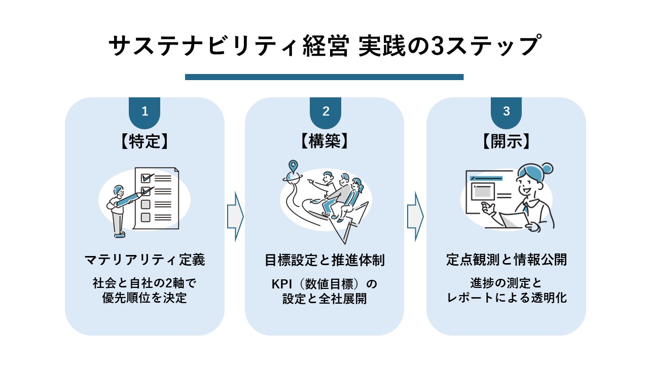 では、実際にサステナビリティ経営を進めるには、どのような手順を踏めばよいのでしょうか。ここでは基本的な3つのステップを紹介します。重要なのは、形だけの宣言で終わらせず、経営戦略と一体化させてPDCAを回すことです。