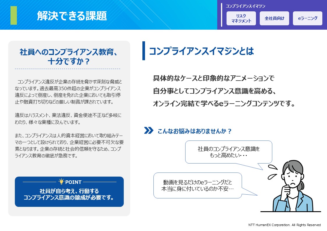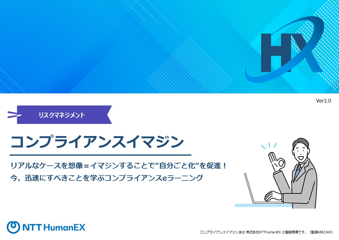 ハラスメントや企業倫理・法令違反等、コンプライアンス違反の具体的な事例から、実際に起こりうるコンプライアンス違反とその対応方法について学べるeラーニングです。架空の企業を例に、リアルなケースを想像=イマジンすることで「自分ごと化」を促進します。