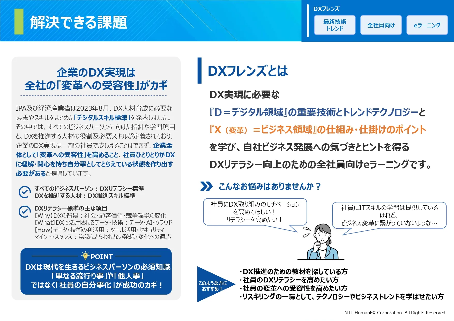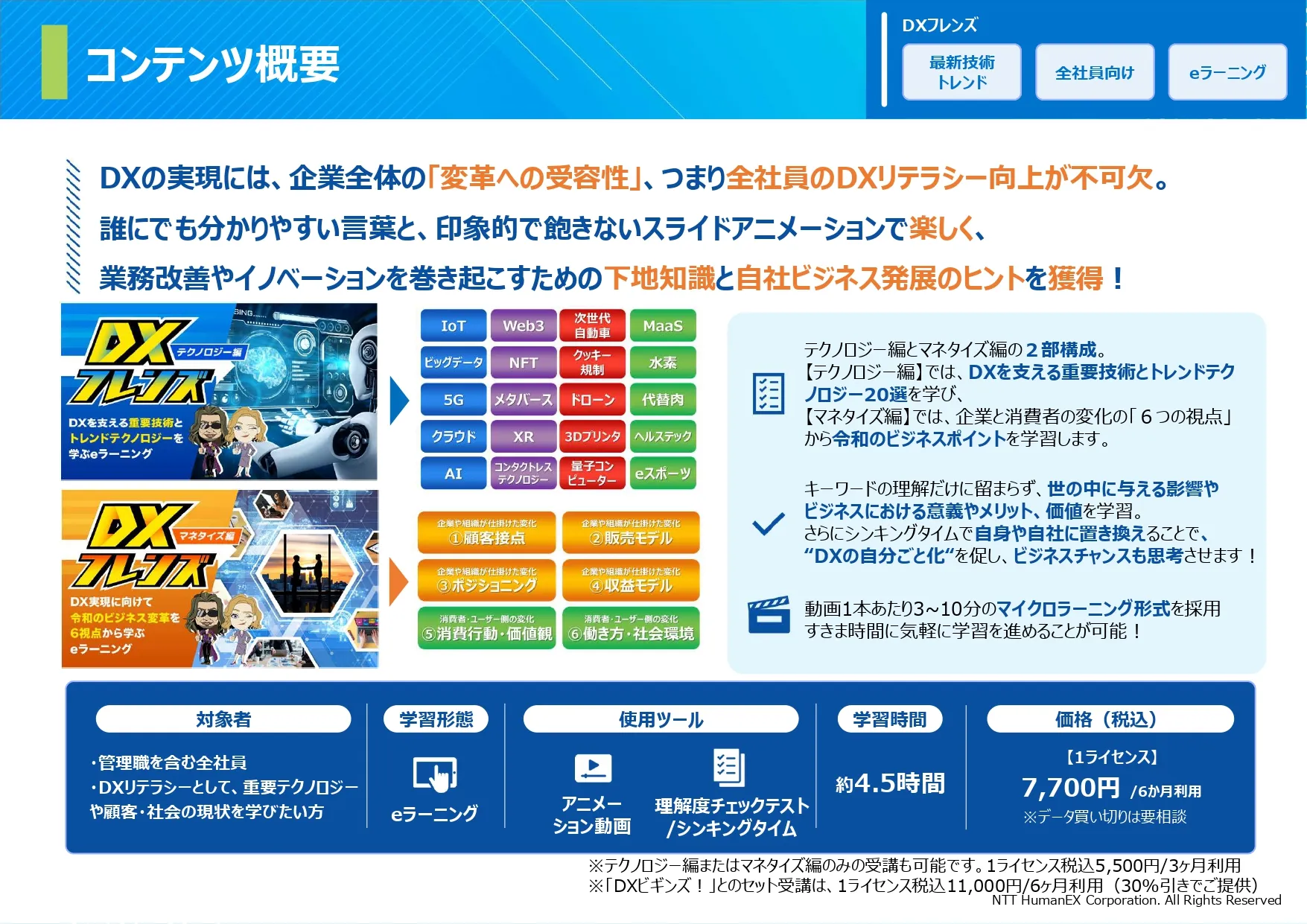 DX実現に必要な「D=デジタル領域」の重要技術と『今』押さえておきたいトレンドテクノロジー、「X(変革)=ビジネス領域」の仕組み・仕掛けのポイントを学び、業務改善やイノベーションにつなげる気づきとヒントを与えるeラーニングです。