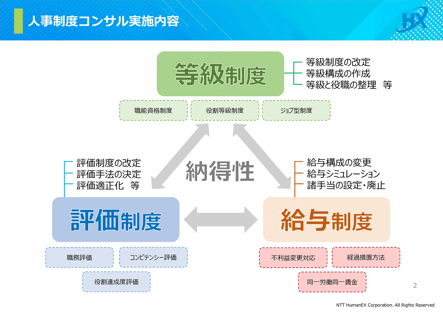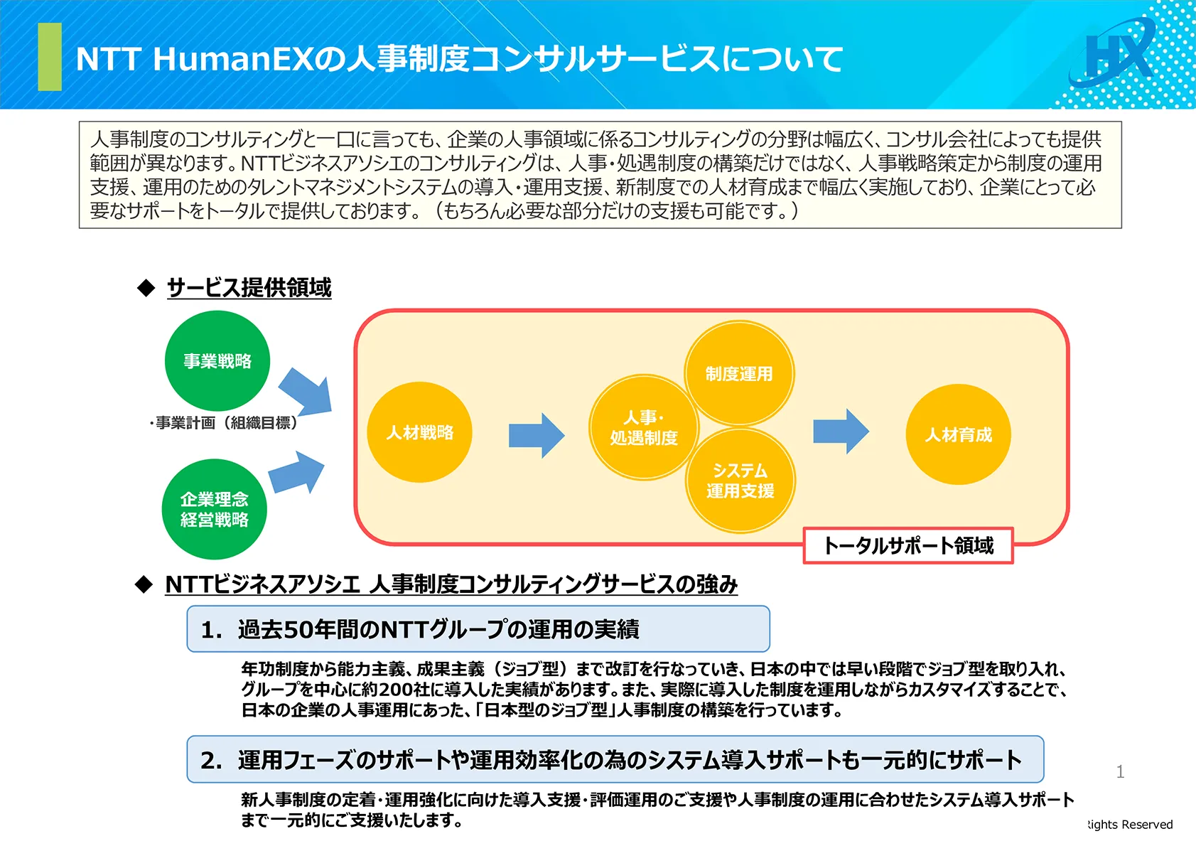 複雑で多角的な視点での検討が求められる人材戦略策定、制度構築、運用ルール策定、運用システムなどの人事領域の業務をトータルで支援いたします。NTTグループの制度構築・運用を通じて培ってきたノウハウを活かした、ワンストップでのトータルサポートをご提供します。