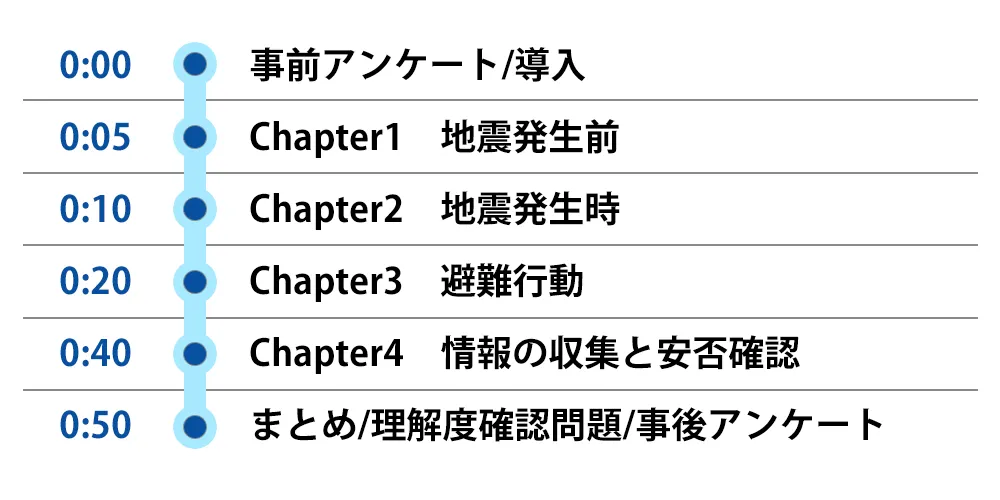 オフィスやテレワーク等、多様化した労働環境で想定されるリアルな地震災害のケースを採用。身近に起こりえる地震災害を疑似体験することで、「自分ごと」として危機感を高めるとともに、様々な労働環境に応じた地震災害の対応を理解します。