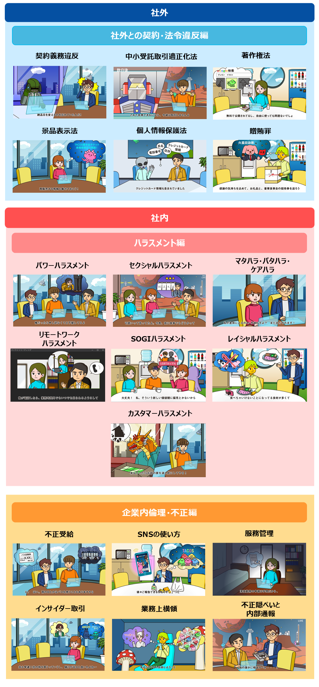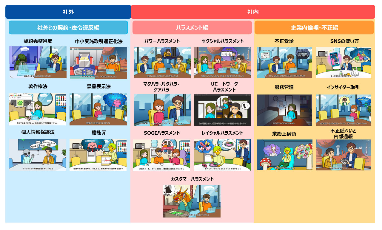「個人情報保護法」や「著作権法」などコンプライアンス違反のよくあるテーマから、「カスハラ」「SOGIハラ」などの最新事例まで幅広く学習いただけます。社外との契約・法令違反編、ハラスメント編、企業内倫理・不正編の3編をご用意しています。