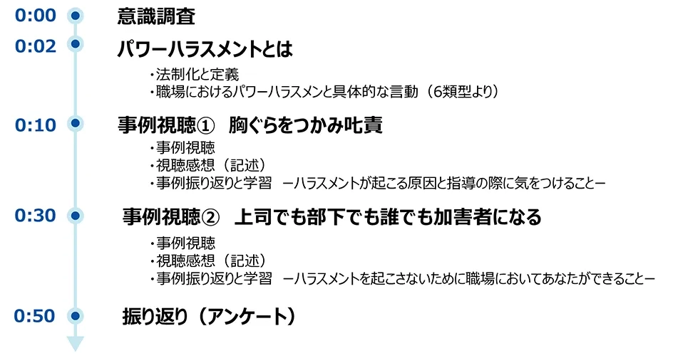 ドラマ仕立てで状況を客観的に把握しやすく、加害者、被害者、第三者それぞれの視点で語られる内容がとても参考になりました。特に、パワハラは上司から受けるものというわけではなく、誰でも加害者になり得るという点にハッとさせられました。ただ単に何がパワハラにあたるのかを説明されるより、ドラマとして世界感に入り込む方が内容の理解が進み、日ごろの状況を具体的に思い浮かべながら振り返りをすることができよい機会になりました。