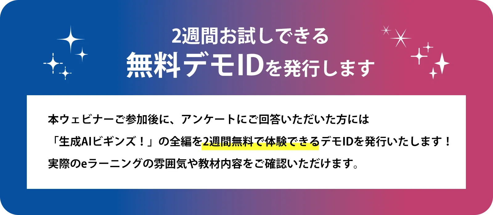そして具体的なアプローチ方法の1つとして、弊社のeラーニングコンテンツである「生成AIビギンズ!」についてもご紹介させていただきます。 組織全体で生成AIを活用し、企業競争を勝ち抜いていくためのヒントをお持ち帰りいただければ幸いです。