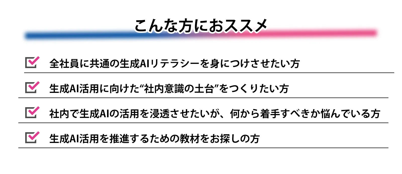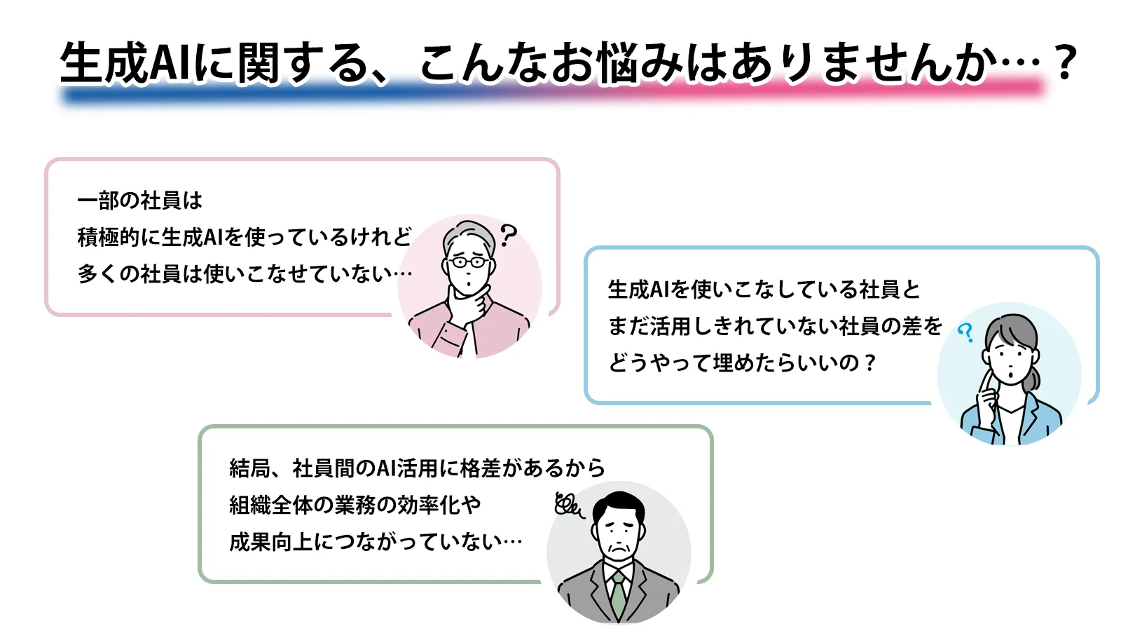 しかし高度化する現代社会においては、全社員が生成AIを使いこなせる組織にならなければ、生産性・人件費などあらゆる面で企業競争に勝てなくなる時代が目の前まで来ています。