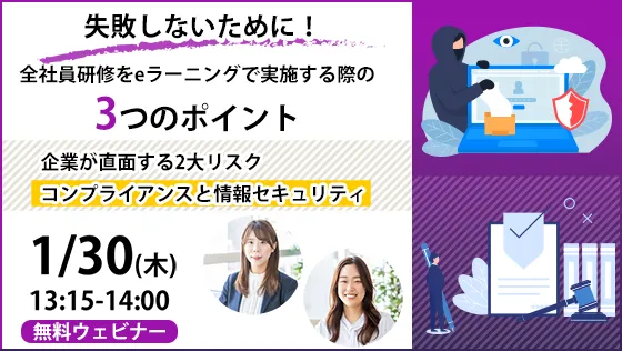 コロナ禍や働き方の変化などにより、eラーニングを活用した全社員教育が定着しつつあります。一方で、実際にはeラーニングの導入や運用において、多くの企業が障壁に直面しています。特に「学習者のモチベーション維持」が大きな課題であり、学習者任せの状態では成果がでにくいという現状が浮き彫りになっています。企業が直面するコンプライアンスやハラスメント、情報セキュリティ対策について、効果的なeラーニングコンテンツをご紹介します。